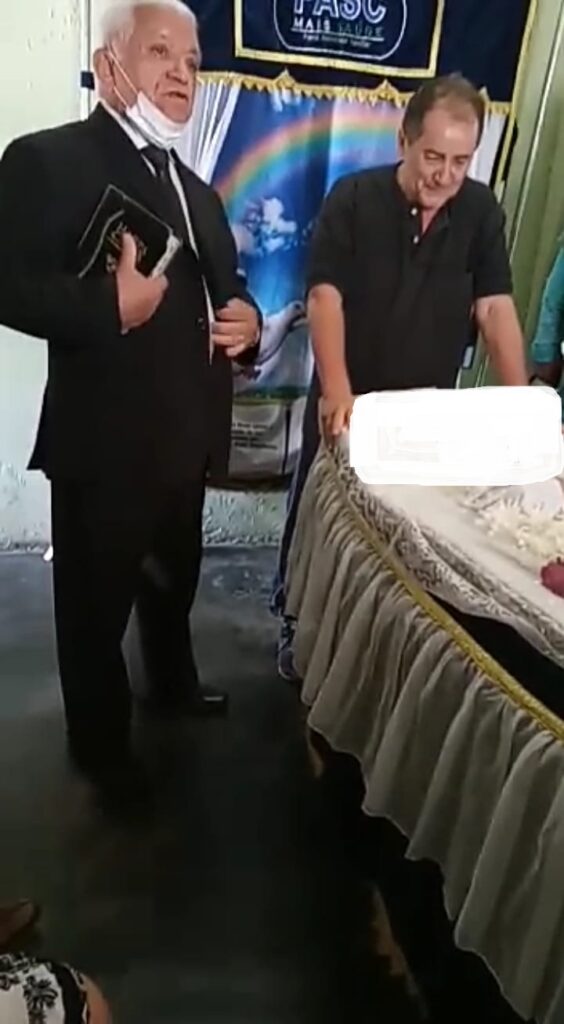 E continua: “Se dissessem assim, você vai entrar agora, tá aqui uma .40, um 38, eles estão ali, você vai entrar na cela. – Eu quero entrar Algemado. Mas como assim? Você vai ter que atirar. -Não, eu quero entrar algemado e vou dizer que Jesus é a saída, é a solução, porque se eu fizer isso com eles, eu vou pagar diante do meu Deus, quem com ferro fere com ele será ferido. Diante do pastor, aqui eu quero dizer, não tenho mágoa de ninguém em minha vida, quem fez isso com ele está perdoado em nome de Jesus. Que eles conheçam o evangelho, que a transformação de um homem realmente está em conhecer Jesus. Quero agradecer a vocês que estão aqui e ao pastor que veio a minha casa. Quero dizer que não tenho mágoa e nem vingança, jamais, tudo pertence ao senhor, inclusive a vida dele que serviu a Deus desde criança”, disse ele, que chora logo em seguida apoiado ao caixão, enquanto o pastor está falando.