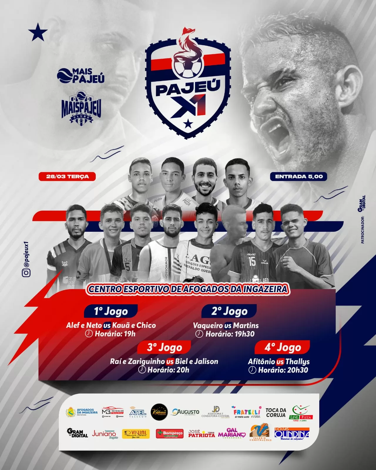 O.maior evento de X1 de Afogados tem o apoio do blog Mais Pajeú, MB Veículos, Gramdigital, Prefeitura de Afogados, Kabbana Recepções, JD Assessoria e Consultoria Contábil, Fratelli, Leve Pizza, Atel, Toca da Coruja, Augusto Valadares, Gal Mariano, Lojas Olindina e Farmácia Bompreço