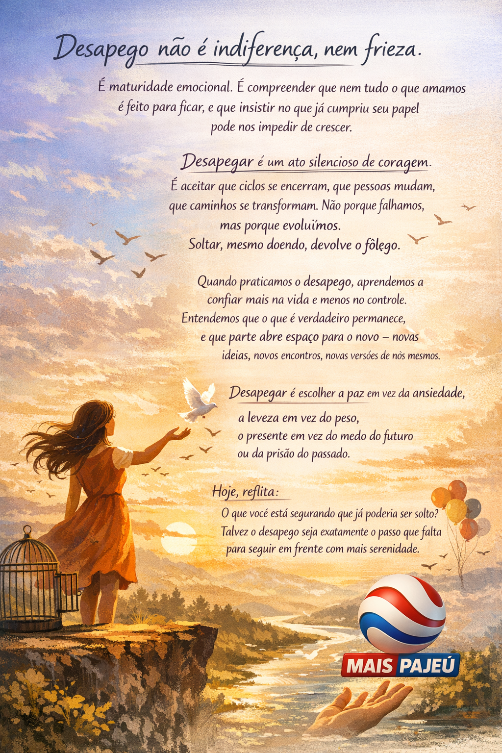 Quando praticamos o desapego, aprendemos a confiar mais na vida e menos no controle. Entendemos que o que é verdadeiro permanece, e o que parte abre espaço para o novo — novas ideias, novos encontros, novas versões de nós mesmos.