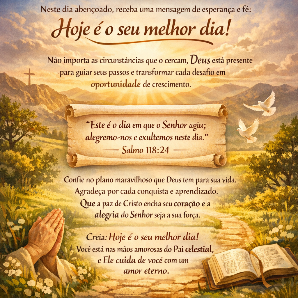 Neste dia abençoado, receba uma mensagem de esperança e fé: hoje é o seu melhor dia! Não importa as circunstâncias que o cercam, Deus está presente para guiar seus passos e transformar cada desafio em oportunidade de crescimento.