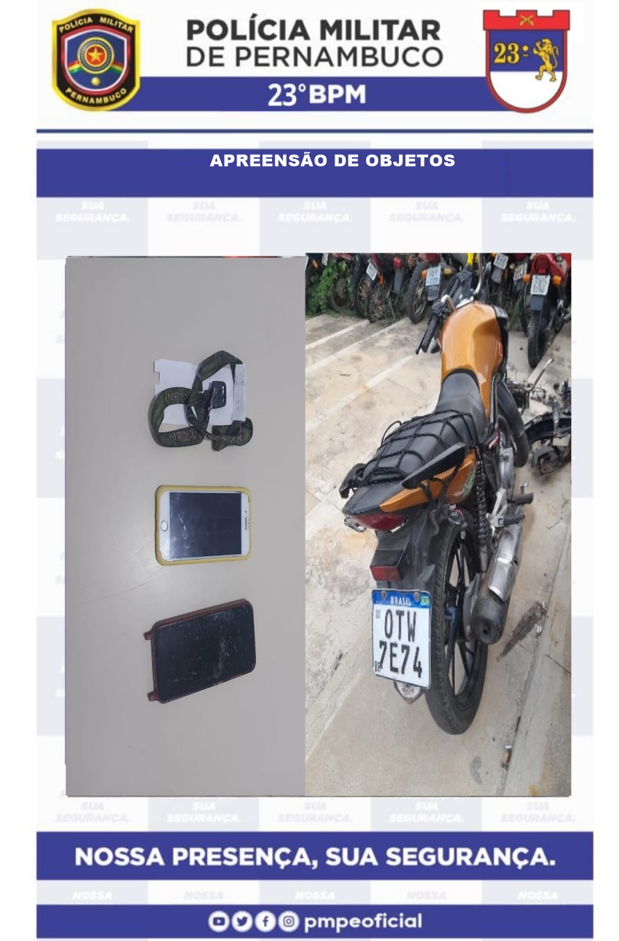 Na noite do último sábado (16/08), Policiais Militares do 23ºBPM receberam informação que uma motocicleta foi tomada de assalto por quatro indivíduos, mediante ameaça de estarem armados, no bairro Riacho do Gado, em Tabira-PE.