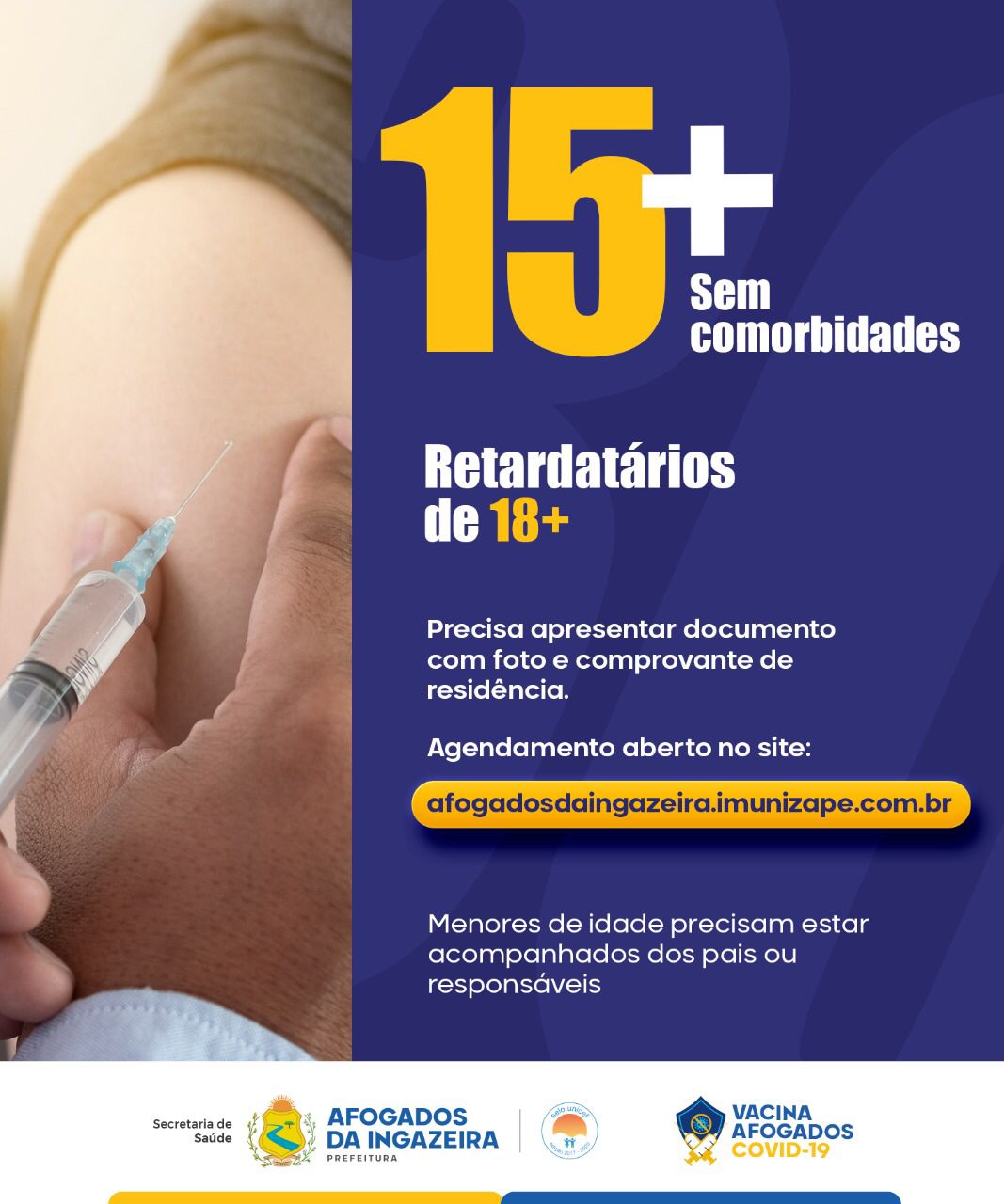 Está aberto o agendamento para a vacinação de jovens de 15 anos ou mais, sem comorbidades. Além da documentação pessoal, mais comprovante de residência, é preciso estar acompanhado dos pais ou responsáveis!no aro da vacinação.