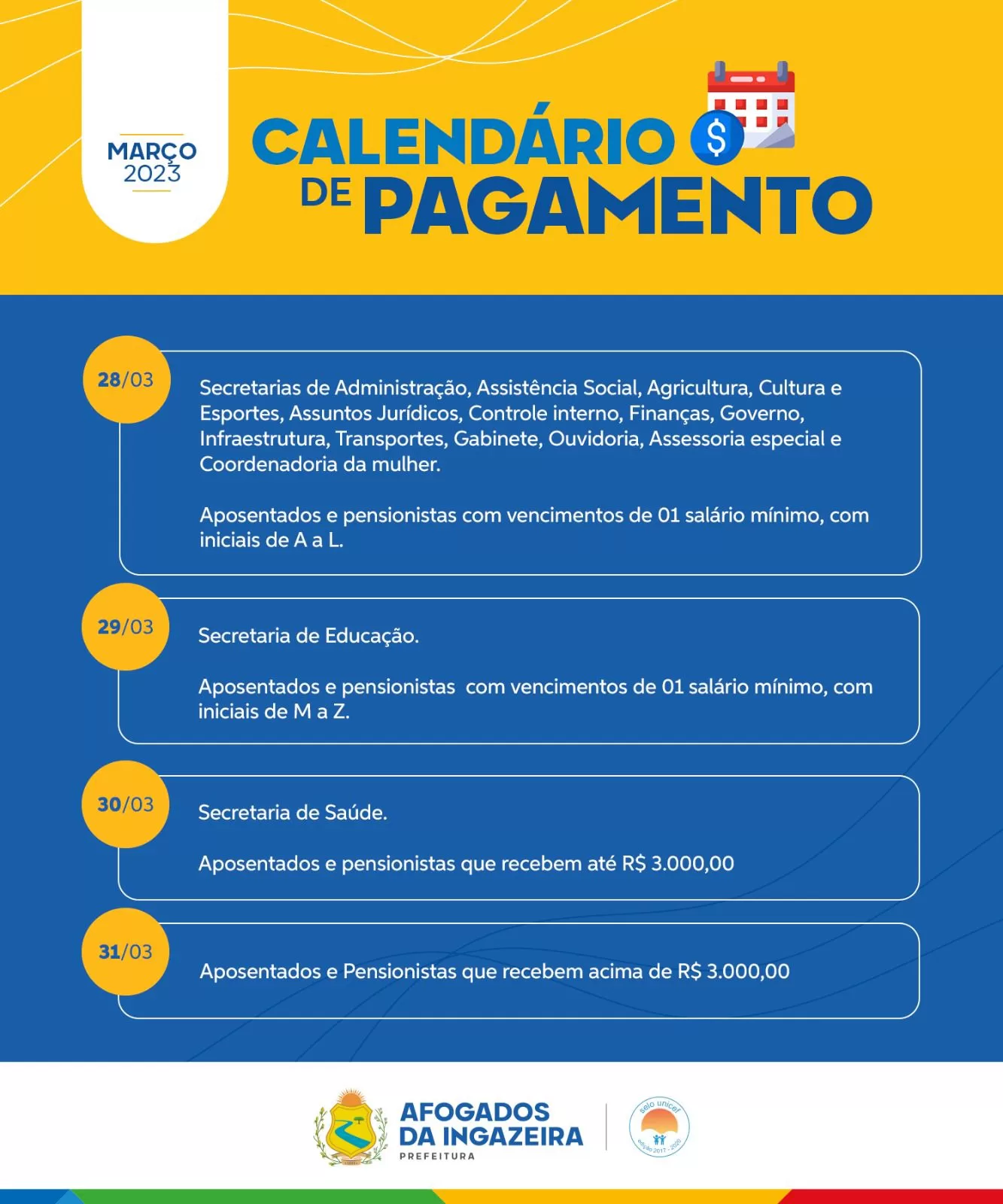 Secretarias de Administração, Assistência Social, Agricultura, Assuntos Jurídicos, Controle interno, Cultura e esportes, Finanças, Governo, Infraestrutura, Transportes, Gabinete, Ouvidoria, Assessoria especial e Coordenadoria da mulher, além de Aposentados e Pensionistas com vencimentos de 01 salário mínimo, com iniciais de A a L.