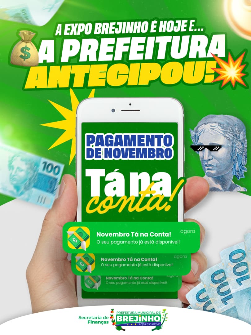 A Prefeitura de Brejinho antecipou, nesta sexta-feira (14), o pagamento do mês de novembro para os servidores municipais. Receberam os vencimentos os funcionários do quadro efetivo, comissionados, contratados, além dos aposentados e pensionistas, que já estão com o salário na conta.