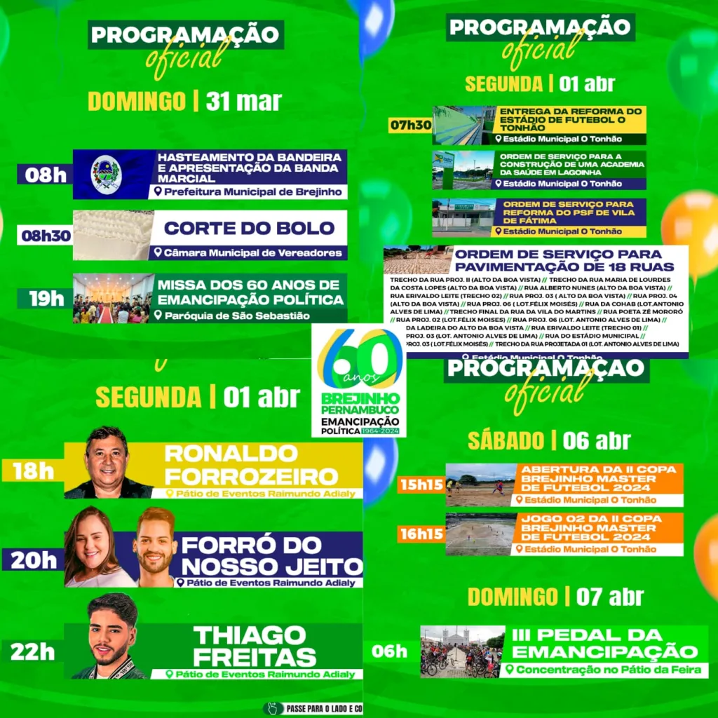 No dia 31 de março Brejinho completa 60 anos de Emancipação Política, e a Prefeitura Municipal de Brejinho divulgou nesta quinta-feira (28), uma programação especial para celebrar o aniversário da cidade, com assinaturas de ordens de serviço, eventos, shows e muito mais! Confira a programação completa: