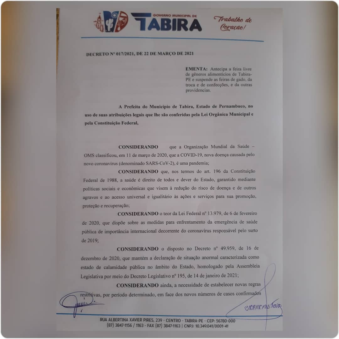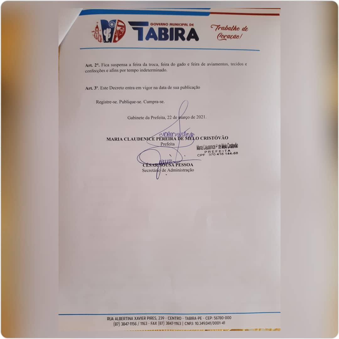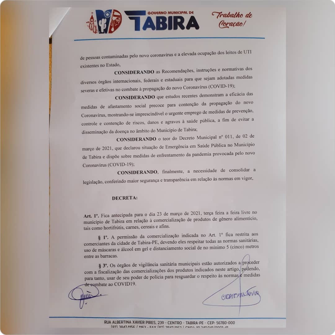 Prefeitura de Tabira divulga decreto municipal