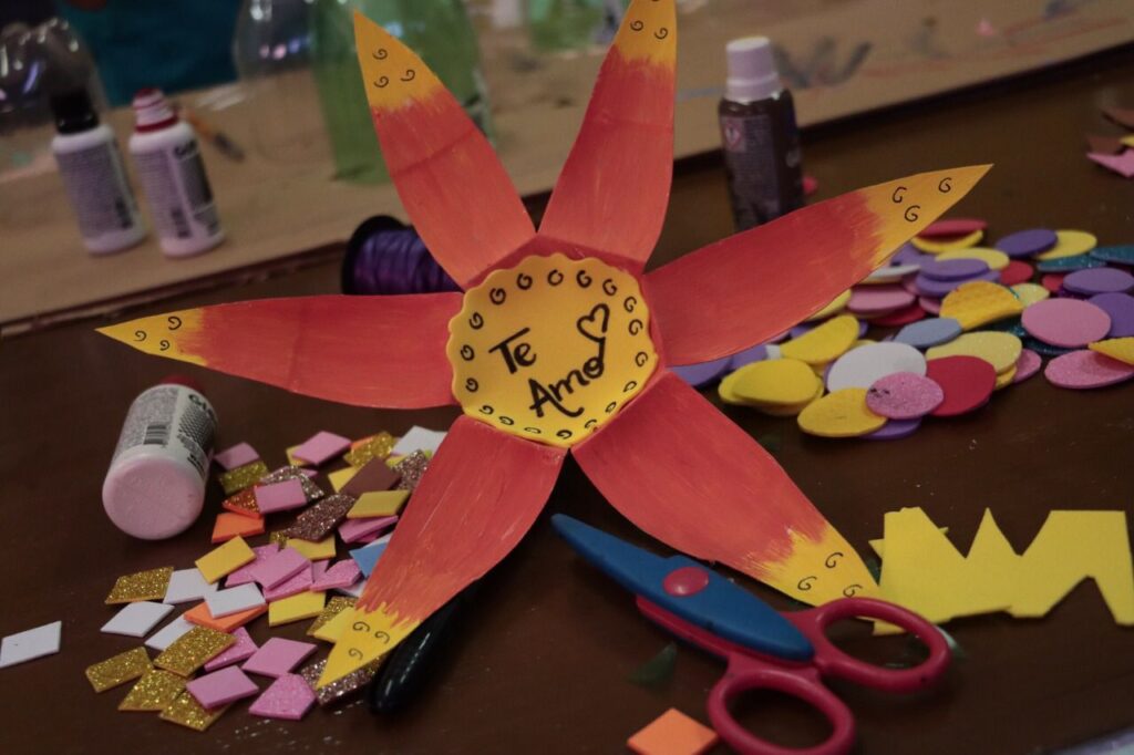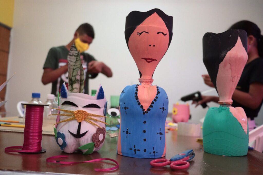 São trabalhados materiais como garrafa pet, papelão, emborrachados e isopor. As crianças aprendem técnicas de pintura em tela, pintura em garrafas, e de confecção de materiais artesanais diversos, como caqueiras, flores artificiais, bonecos, enfeites e brinquedos.