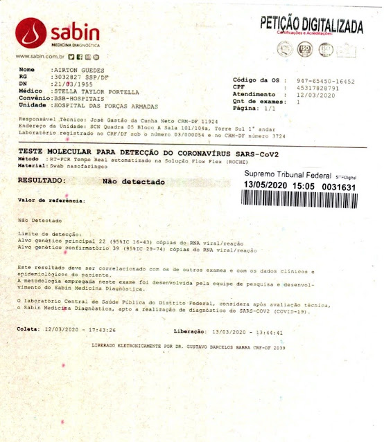 Na noite desta terça-feira (12), a AGU (Advocacia-Geral da União) encaminhou ao ministro do STF os resultados dos exames feitos por Bolsonaro. “Os laudos confirmam que o presidente testou negativo para a doença”, disse o órgão em nota. A decisão ocorreu antes que a Corte analisasse a ação. (R7)