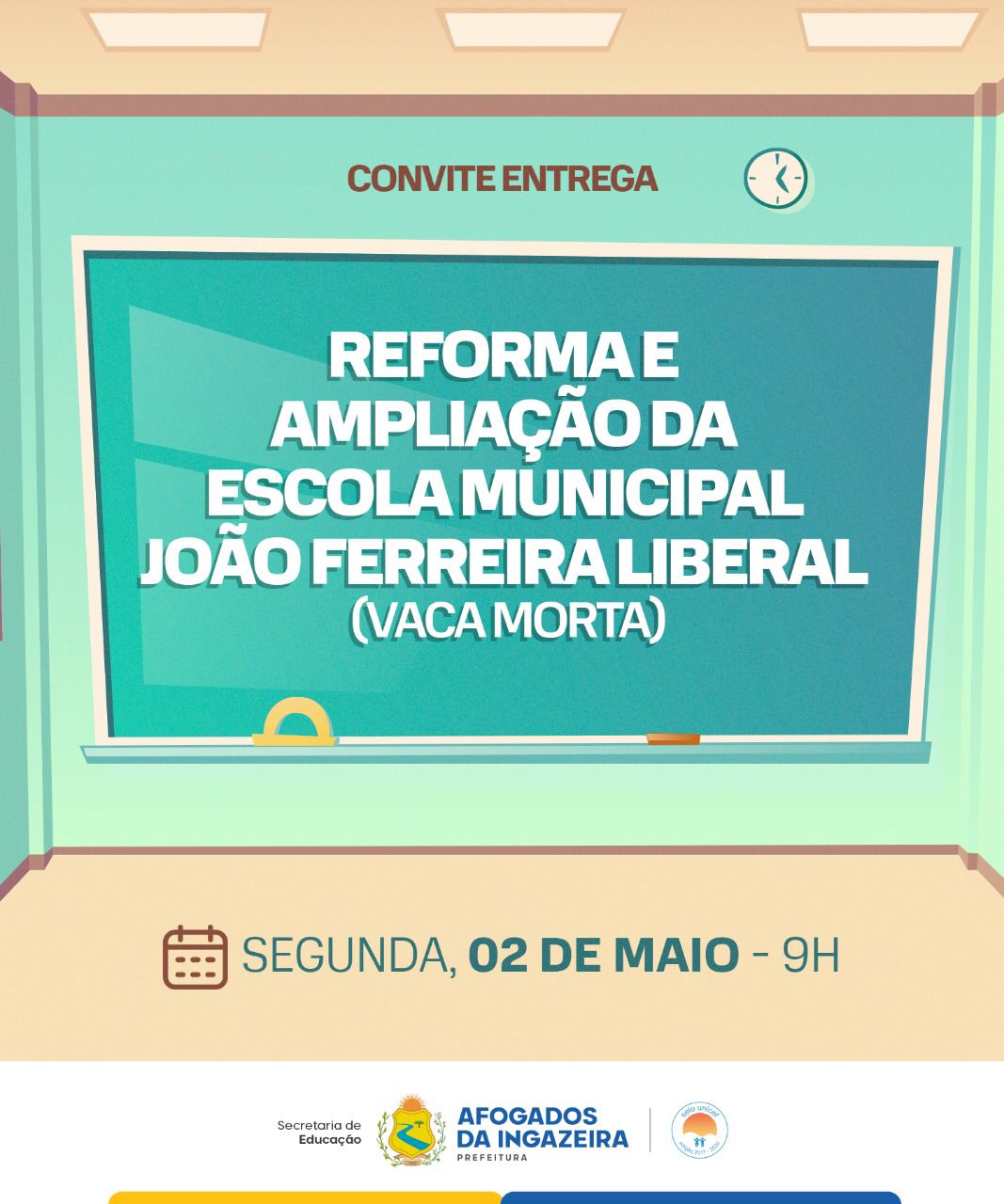 A entrega acontece nesta segunda (02), a partir das 9h, na Vaca Morta. As obras custaram R$ 287.651,81 em recursos próprios, e fazem parte de um grande projeto de reestruturação de diversas escolas municipais executado pela Secretaria Municipal de Educação.