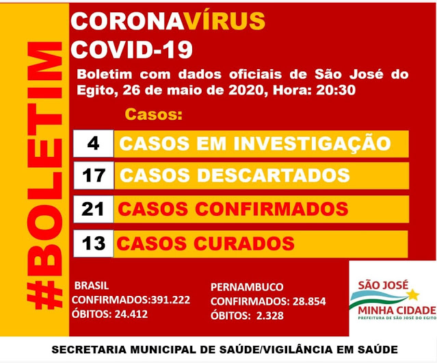 Hoje a secretaria de saúde descartou mais 2 casos suspeitos de COVID 19 e recebeu a confirmação de mais um caso. O paciente esta internado em outro município, e segue sob cuidados médicos e de enfermagem, seu estado de saúde é estável até o momento. Noticiamos também que temos mais 6 casos curados, o que nos remete a 13 pacientes curados da COVID 19.