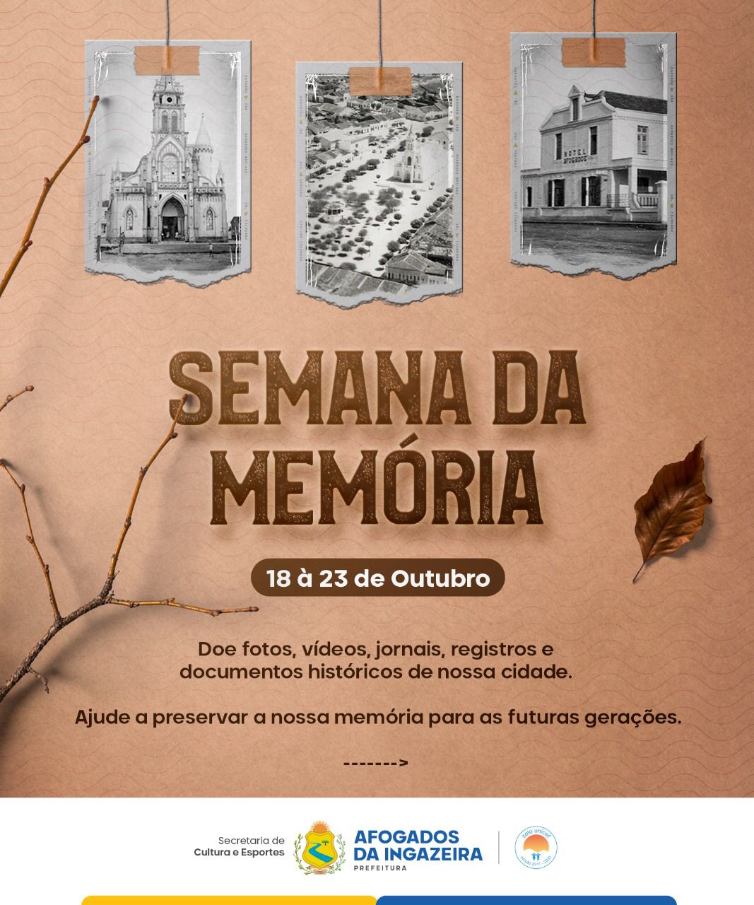 A Prefeitura de Afogados promove, de 18 à 23 de outubro, a SEMANA DA MEMÓRIA. Durante toda a semana, a população vai poder doar para o acervo do arquivo público municipal, fotos, jornais ou revistas que falem do município, objetos antigos, ou peças que remetam à memória da cidade, material em audiovisual, cartas, livros, documentos, etc.