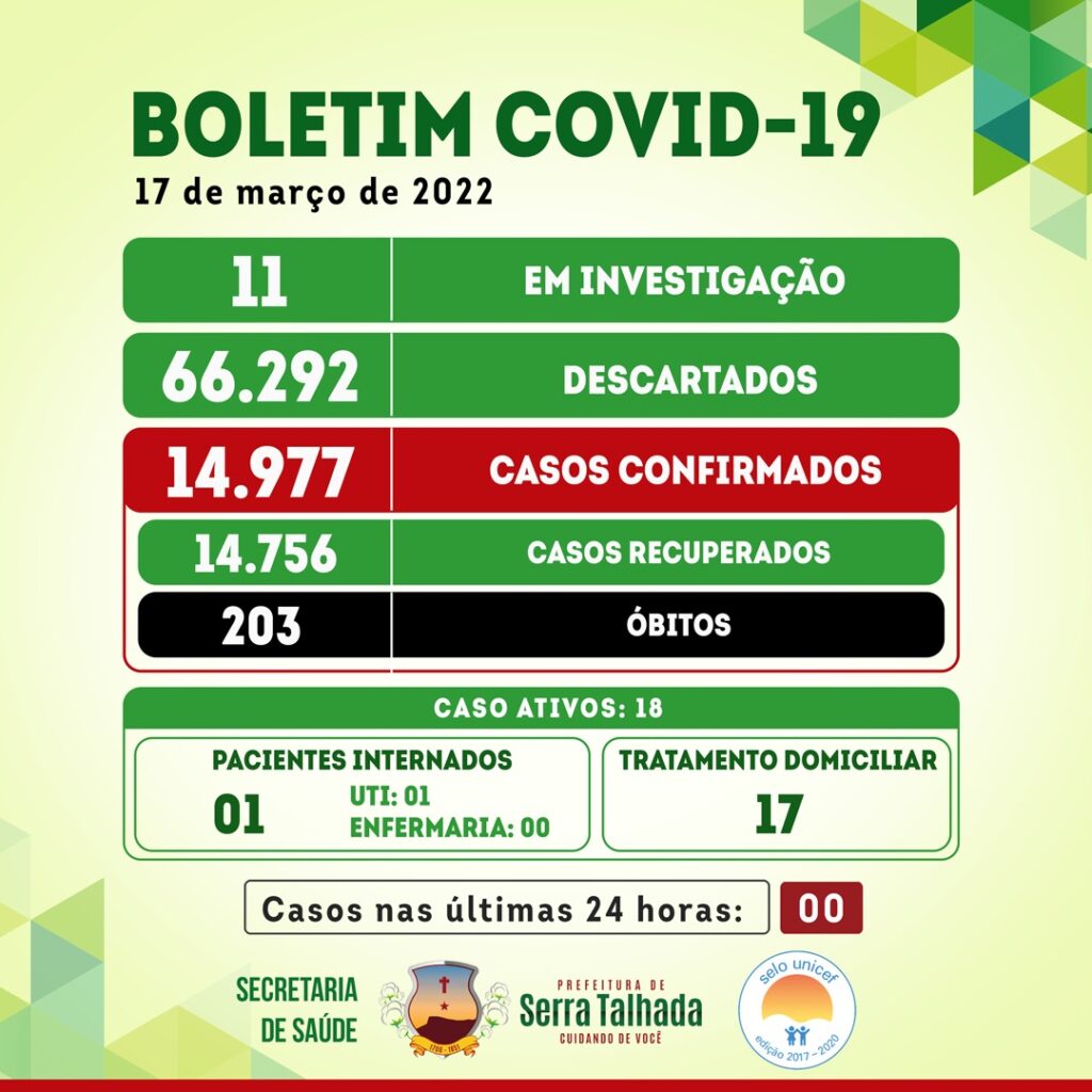 A Secretaria Municipal de Saúde de Serra Talhada informa que não registrou nenhum caso positivo de Covid-19 no Boletim Epidemiológico desta quinta-feira (17/03), referente às últimas 24 horas.