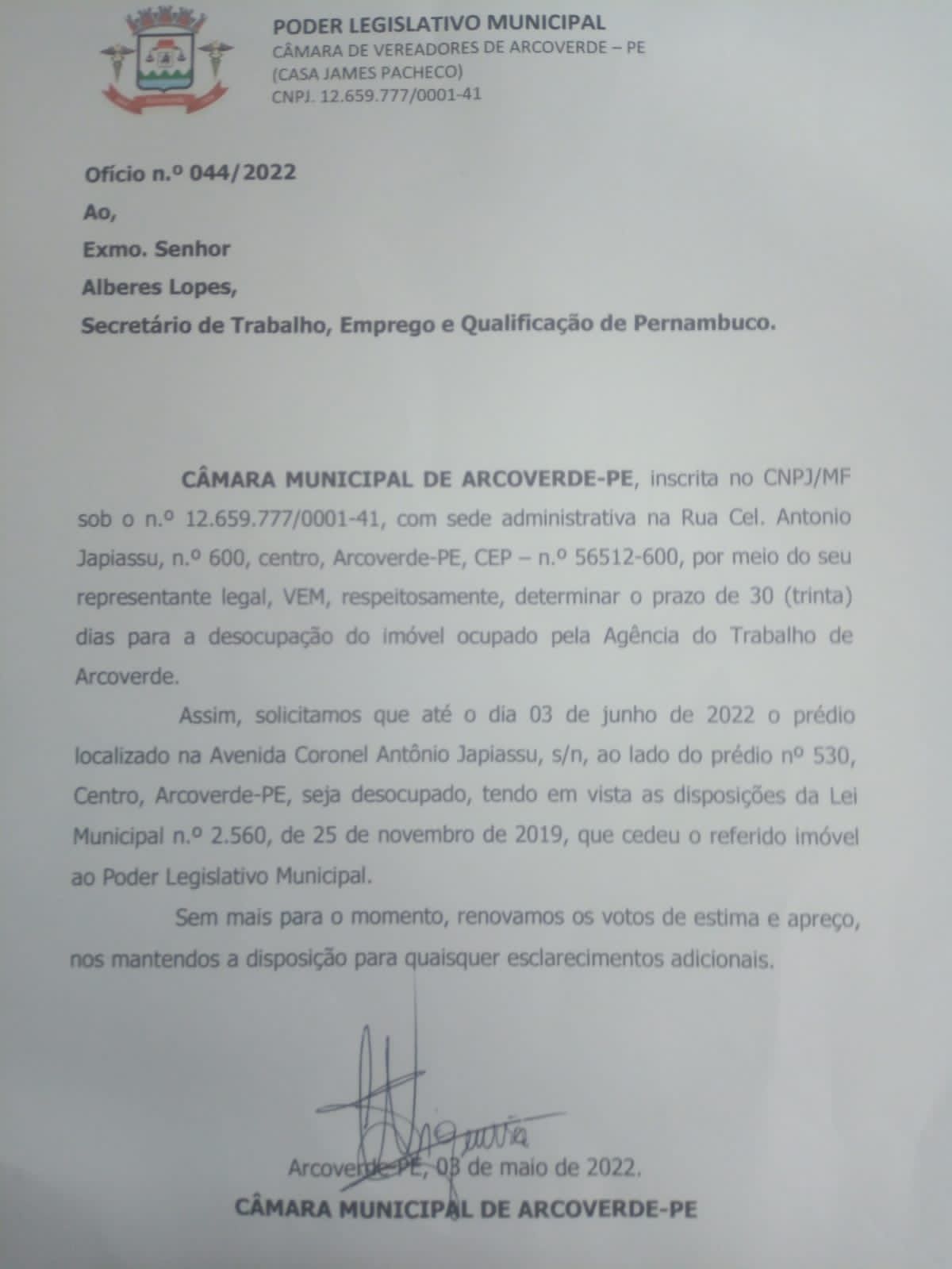 Através do Ofício n° 044/2022, enviado hoje ao Secretário Estadual de Trabalho, Emprego e Qualificação de Pernambuco, Alberes Lopes, em nome da Câmara Municipal de Vereadores, Siqueirinha determinou novamente a desocupação do imóvel como já havia feito em 2021, dando o prazo de 30 dias, equivalente até 03 de junho de 2022, para que a equipe da referida agência efetive o encerramento das funcionalidades no local.