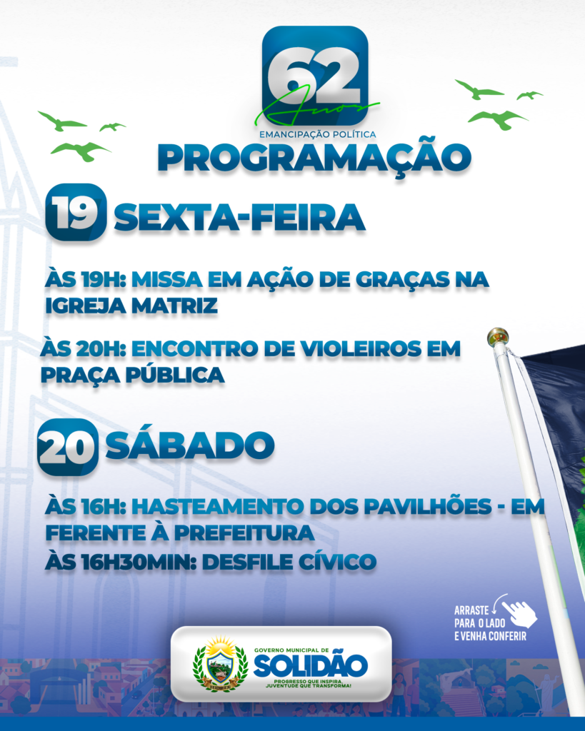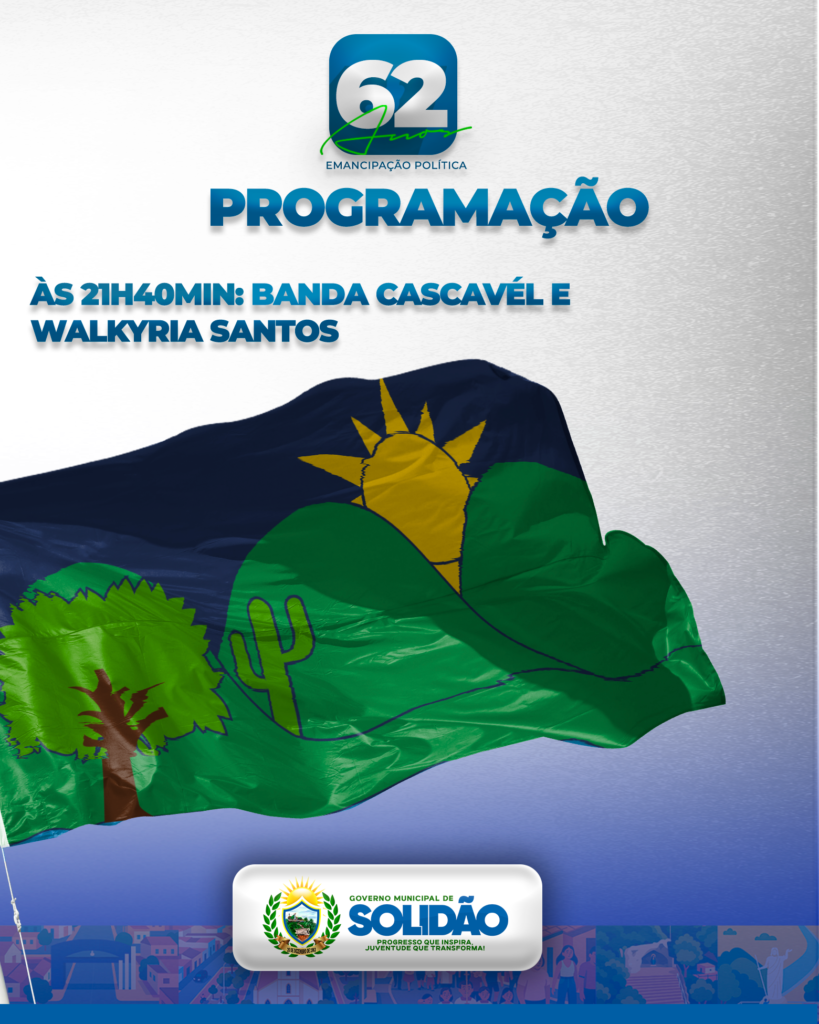 A Prefeitura de Solidão divulgou a programação oficial em comemoração aos 62 anos de Emancipação Política do município, com atividades realizadas na sexta-feira (19) e no sábado (20) de dezembro.