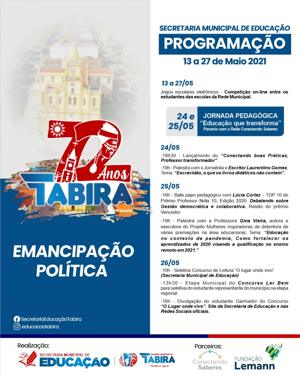 Entre os dias 24 e 25 de maio será vivenciada, de forma remota – através da Plataforma Google Meet, a 1º edição da Jornada Pedagógica: “Educação que transforma”, tal ação é fruto da parceria da Secretaria de Educação de Tabira com a Rede Conectando Saberes (Rede nacional de professores apoiada pela Fundação Lemann) e trará palestras/lives com nomes de peso do cenário educacional nacional, como o Jornalista e Escritor Laurentino Gomes, a Professora Lúcia Cortez (Top 10 do Prêmio Educador Nota 10 do ano 2020) e a professora Gina Vieira (Autora do Projeto Mulheres inspiradoras e Prêmio Ibero- Americano de Educação em Direitos Humanos) tendo como público-alvo os docentes das redes municipal, estadual e particular de Tabira. As inscrições para participação nas palestras serão através de formulário eletrônico encaminhado as escolas.