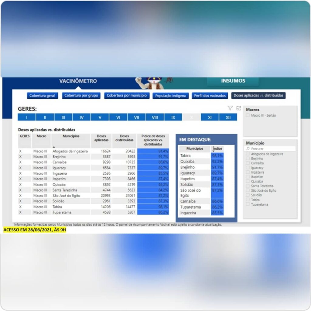 Segundo dados da Secretaria Estadual de Saúde, Tabira utilizou 98,1% das doses recebidas de imunizantes contra a Covid-19.