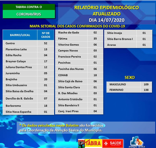 Segue o Relatório Epidemiológico atualizado, devidamente retificado e de acordo com a nomenclatura OFICIAL dos bairros do município de Tabira.