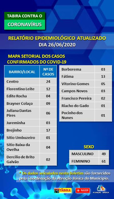 Segue o Relatório Epidemiológico atualizado, devidamente retificado e de acordo com a nomenclatura OFICIAL dos bairros do município de Tabira.