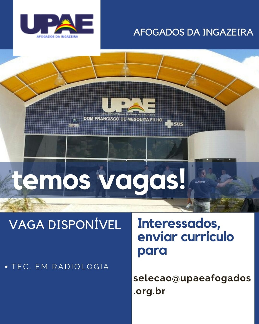 A Unidade Pernambucana de Atendimentos Especializados (UPAE) Dom Francisco de Mesquita Filho, em Afogados da Ingazeira, abriu processo seletivo (Nº 002/2022), com vaga disponível na função de TÉCNICO EM RADIOLOGIA, a fim de desempenhar as funções inerentes à sua profissão. Os interessados devem encaminhar um currículo para o e-mail [email protected], até o dia 21 de fevereiro de 2022, às 10h, com o assunto constando o nome completo do candidato e a função pleiteada. O resultado final será divulgado no dia 22 de fevereiro de 2022. O edital com todas as informações está disponível no site da UPAE (http://upaeafogados.org.br/index.php/editais).