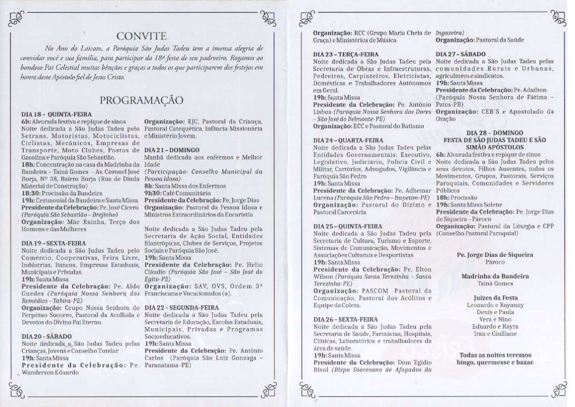 O Pe. Jorge Dias de Siqueira, juntamente a Madrinha da Bandeira Tainá Gomes e juízes da Festa: Leonardo e Rayanny, Denis e Paula, Vera e Nino, Eduardo e Rayra, Iran e Giulliane tem a honra de convidar você e sua família para participar dessa grandiosa festa que terá início nesta quinta-feira 18/10. Desde já agradecemos a presença de todos.