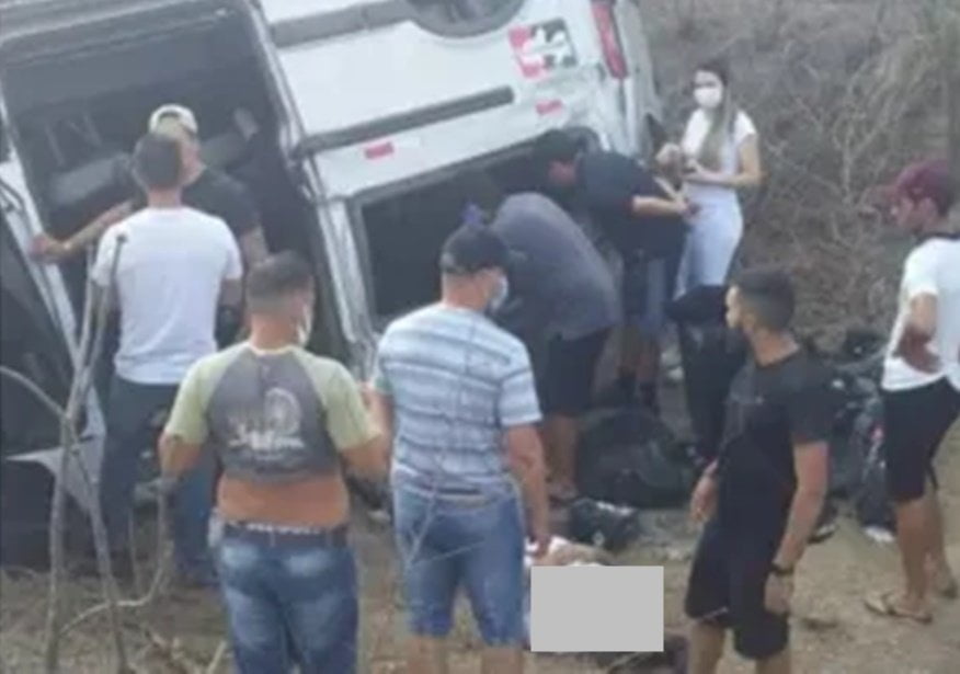Imagens postadas nas redes sociais mostram várias pessoas ao lado da van, que capotou, e algumas deitadas no chão.
